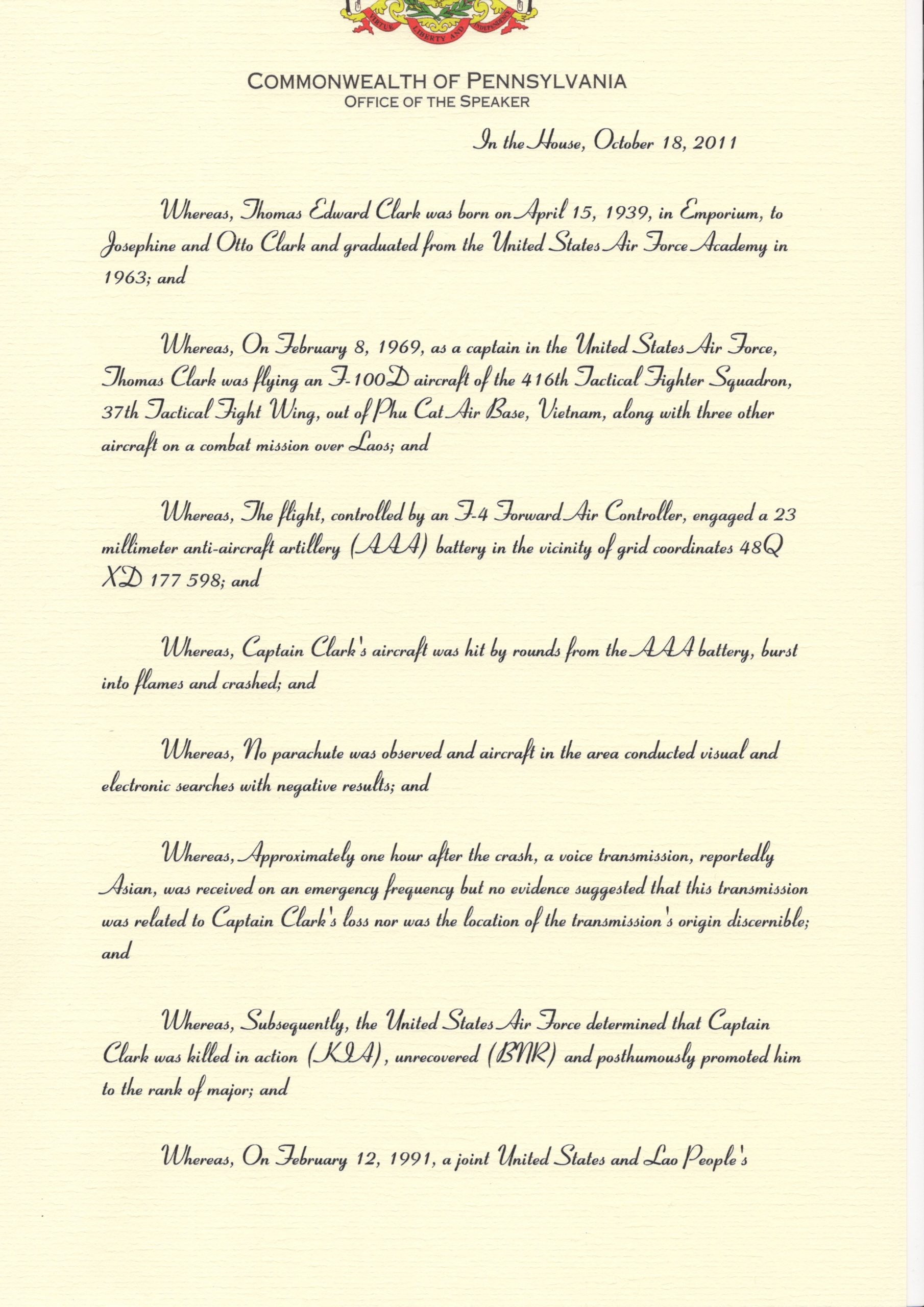 Rep. Thompson Recognizes Major Thomas E. Clark